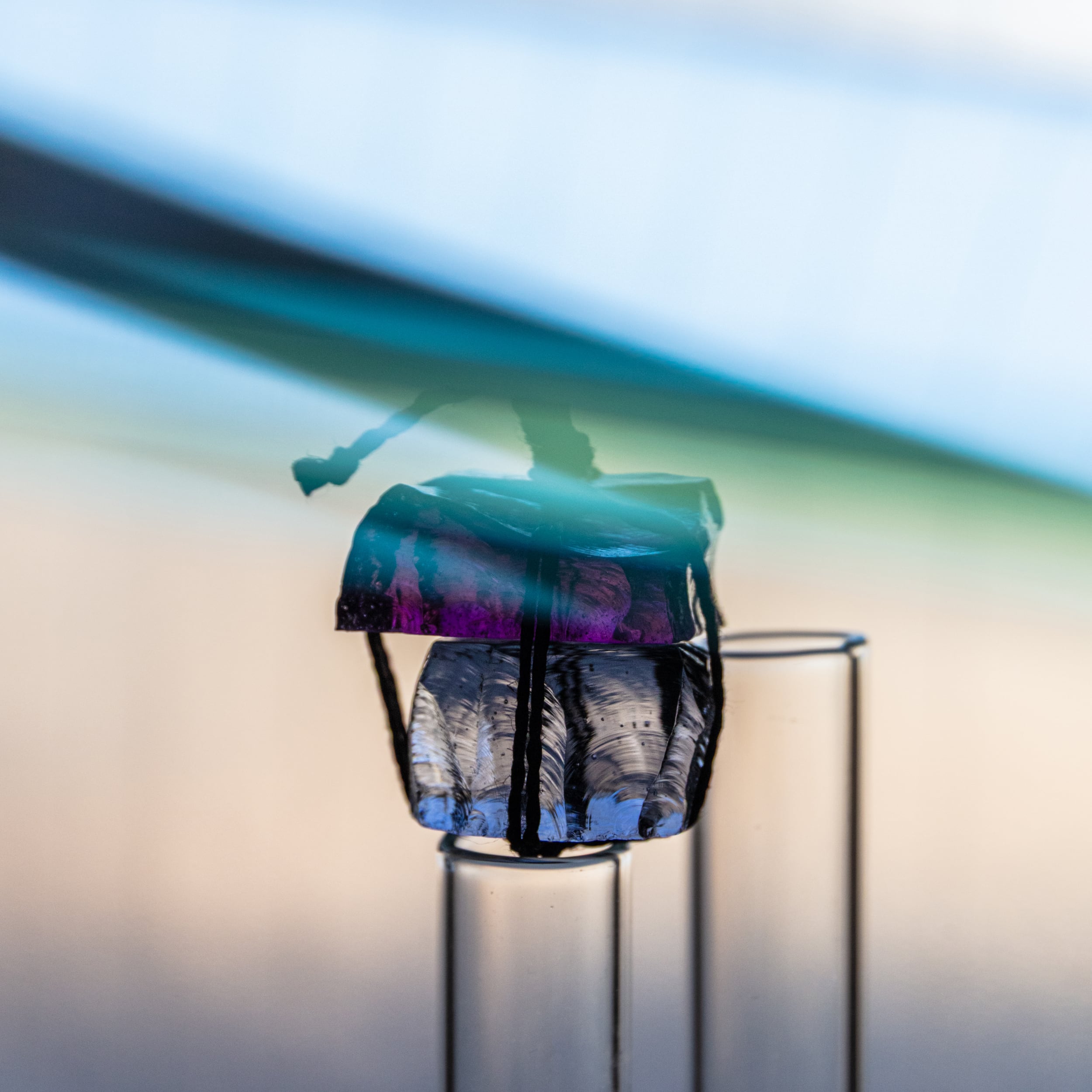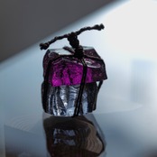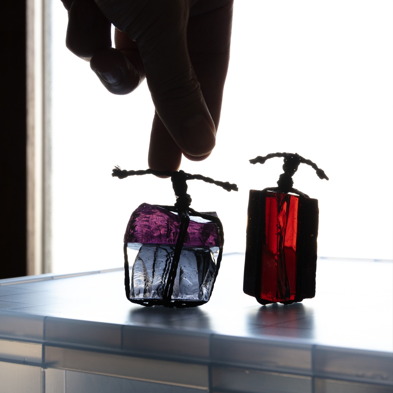 KYU is a SEKIMORI made from scrap stained glass tied with hemp rope used in Shinto rituals.