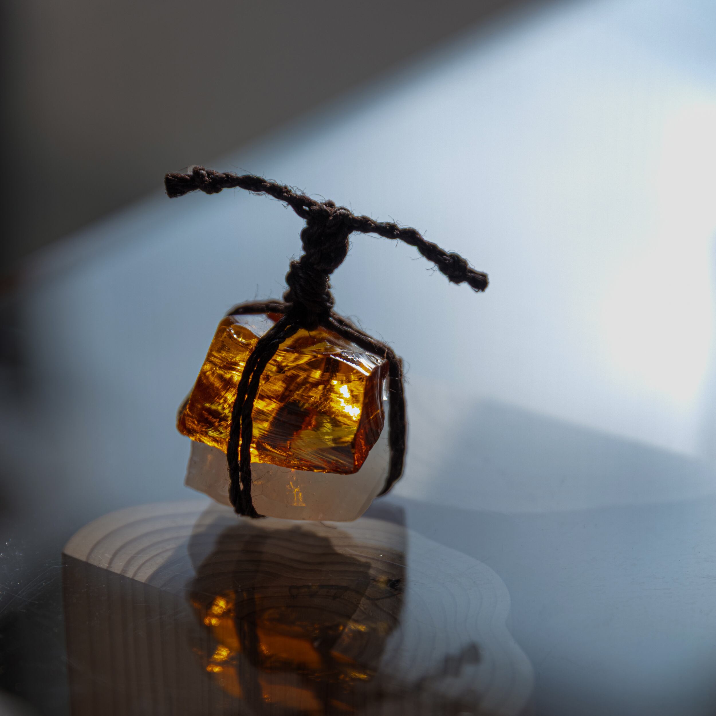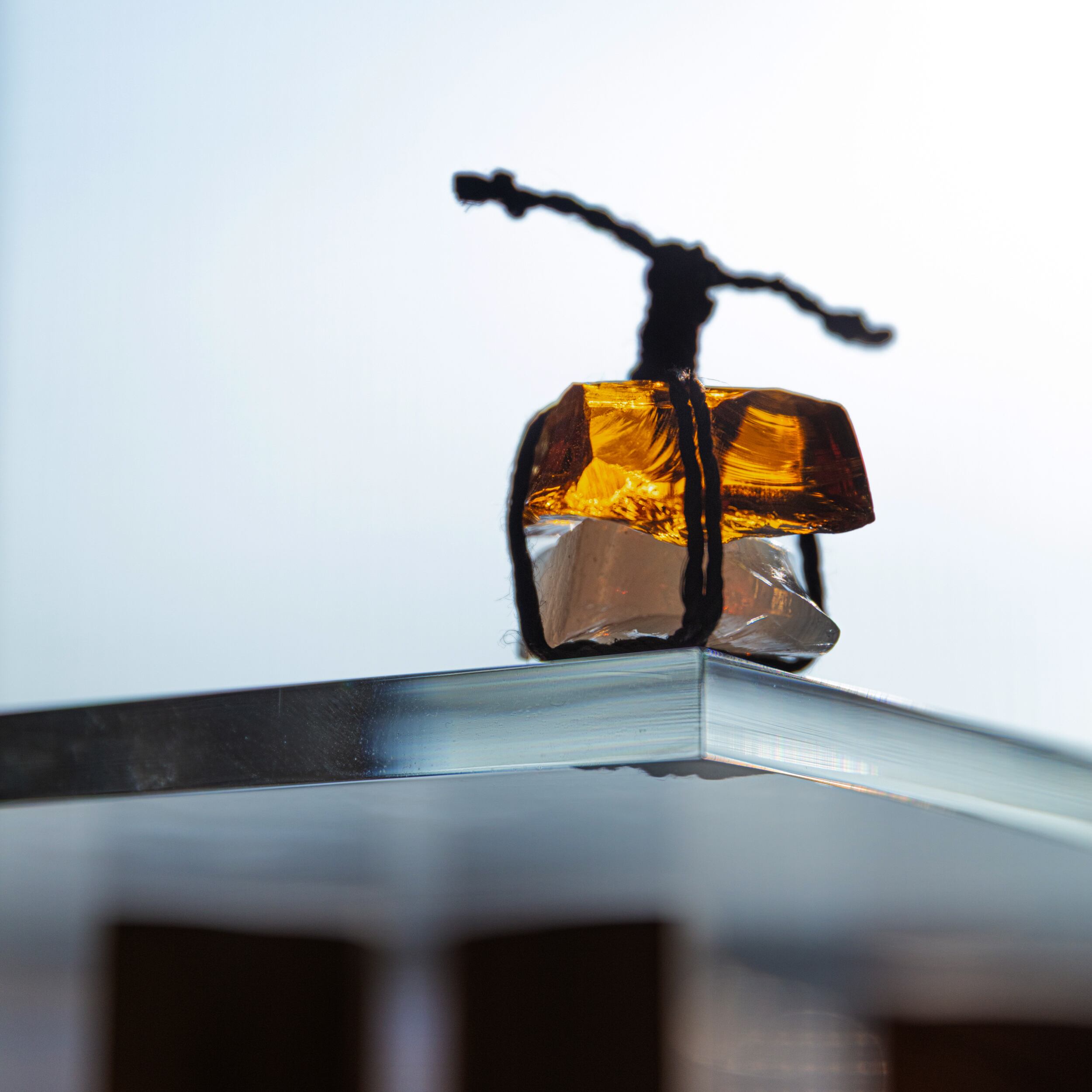 KYU is a SEKIMORI made from scrap stained glass tied with hemp rope used in Shinto rituals.