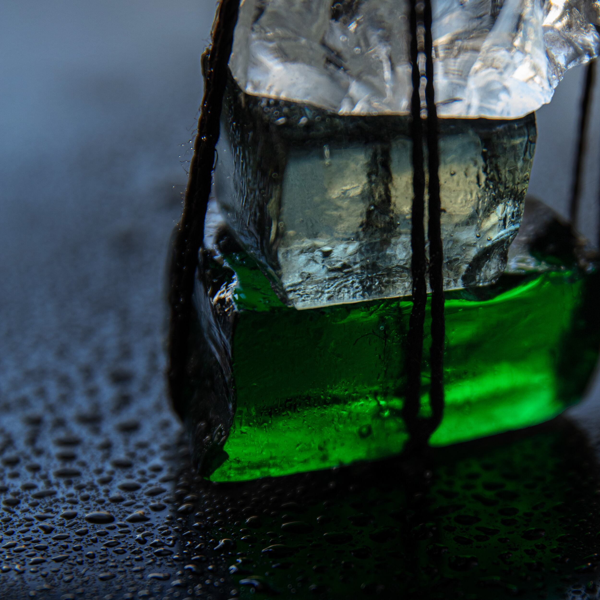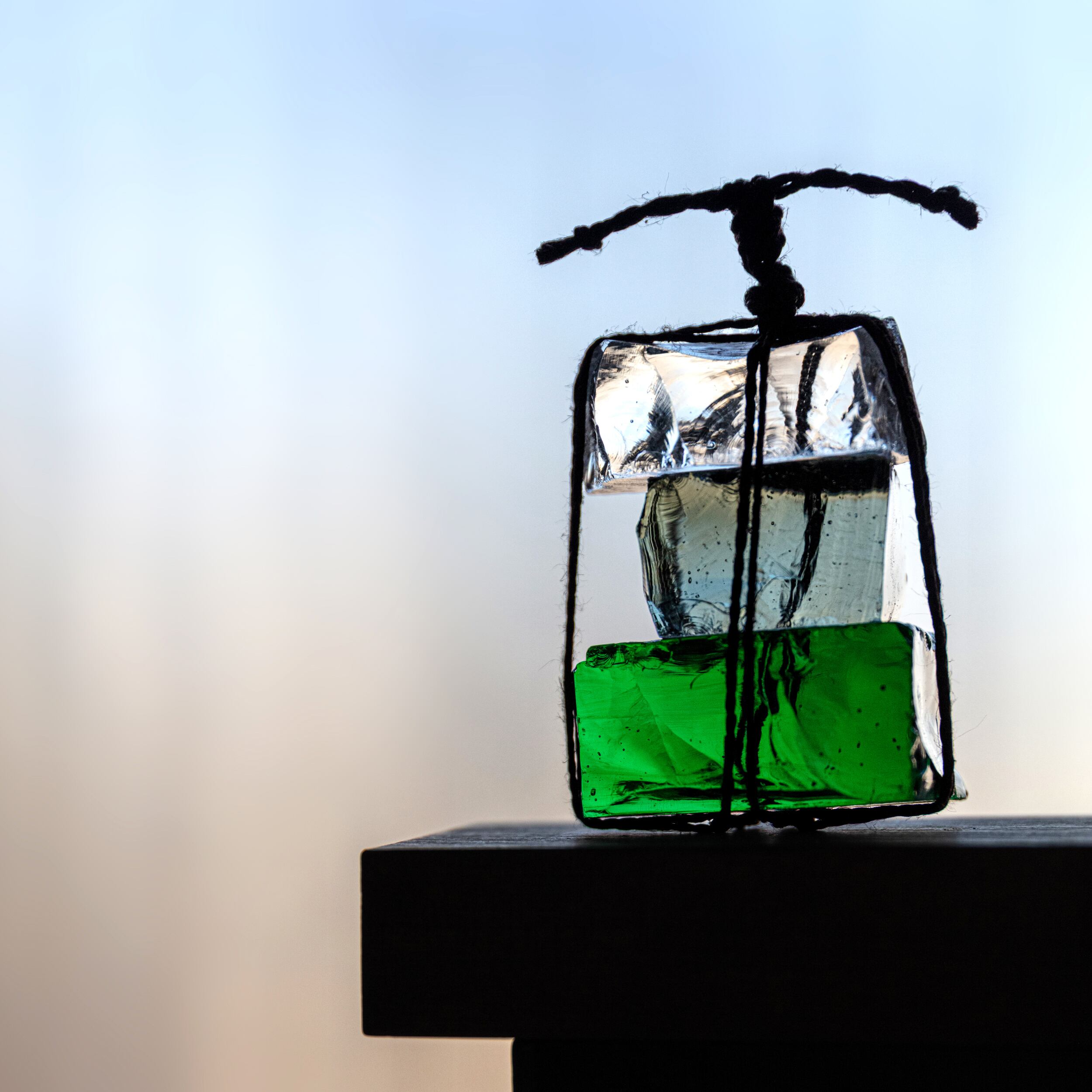 KYU is a SEKIMORI made from scrap stained glass tied with hemp rope used in Shinto rituals.