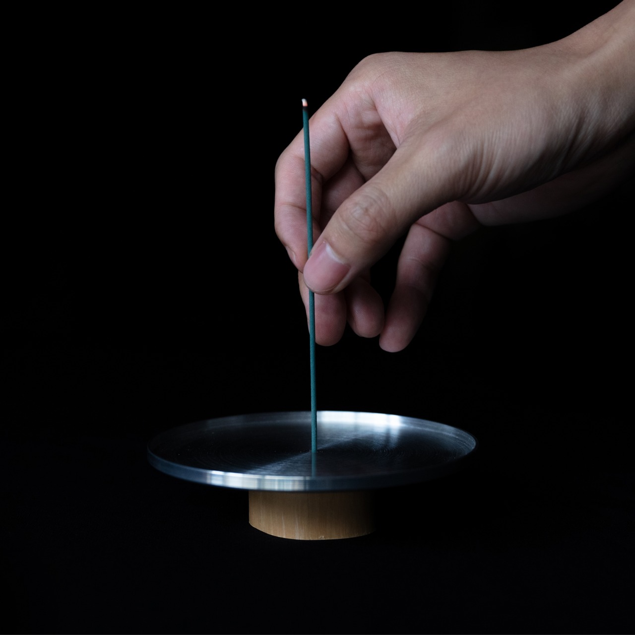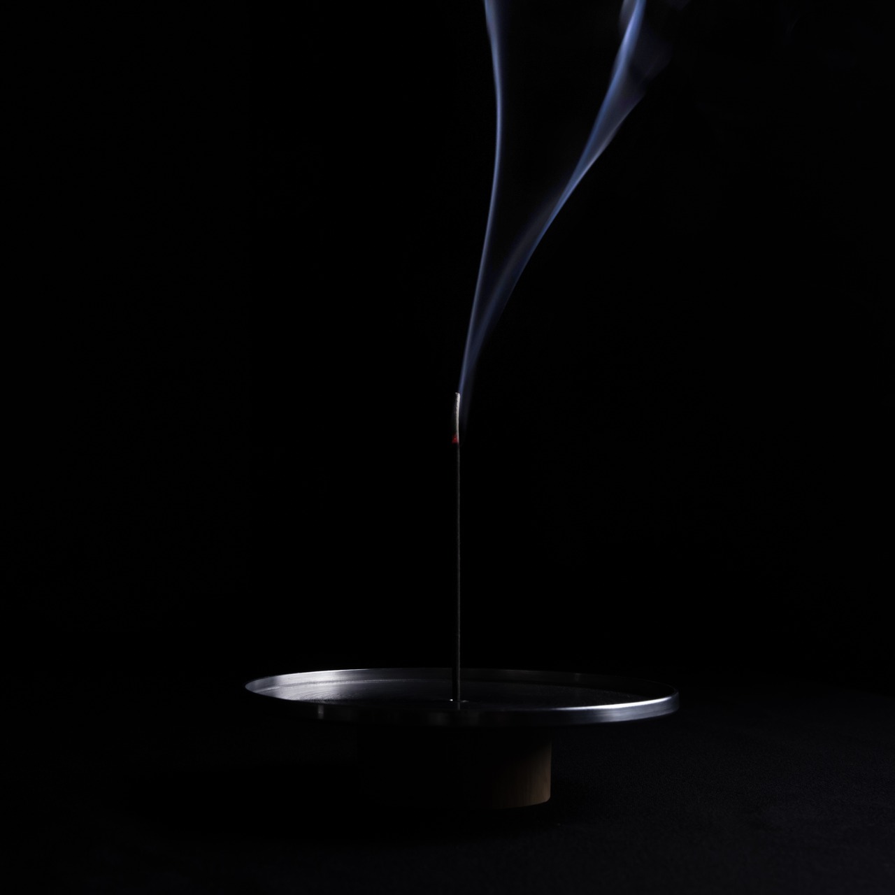 The straight incense sticks and rising smoke evoke the straight branches and leaves of Kitayama cedar, while the ripples on the aluminum dish, created by a scraper,