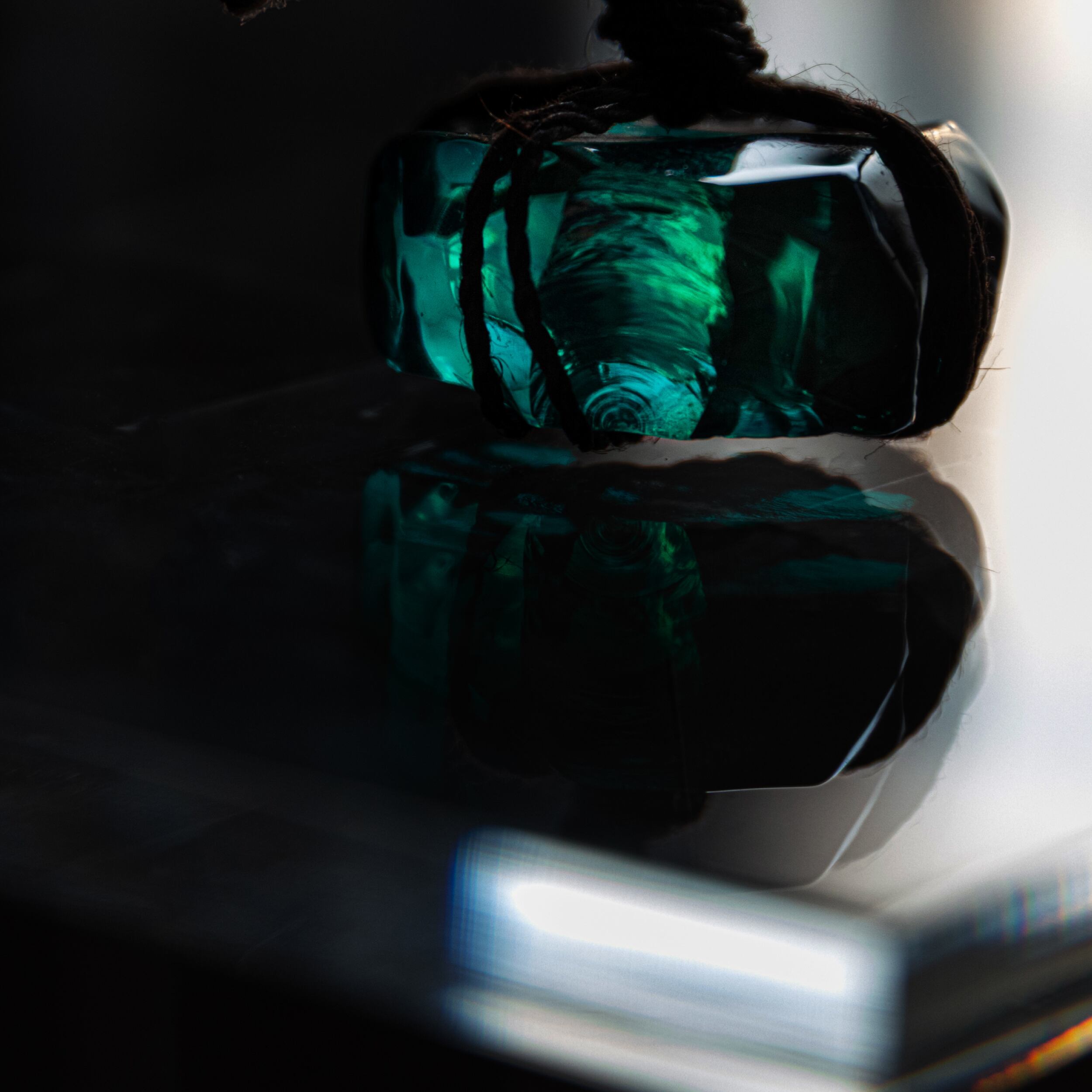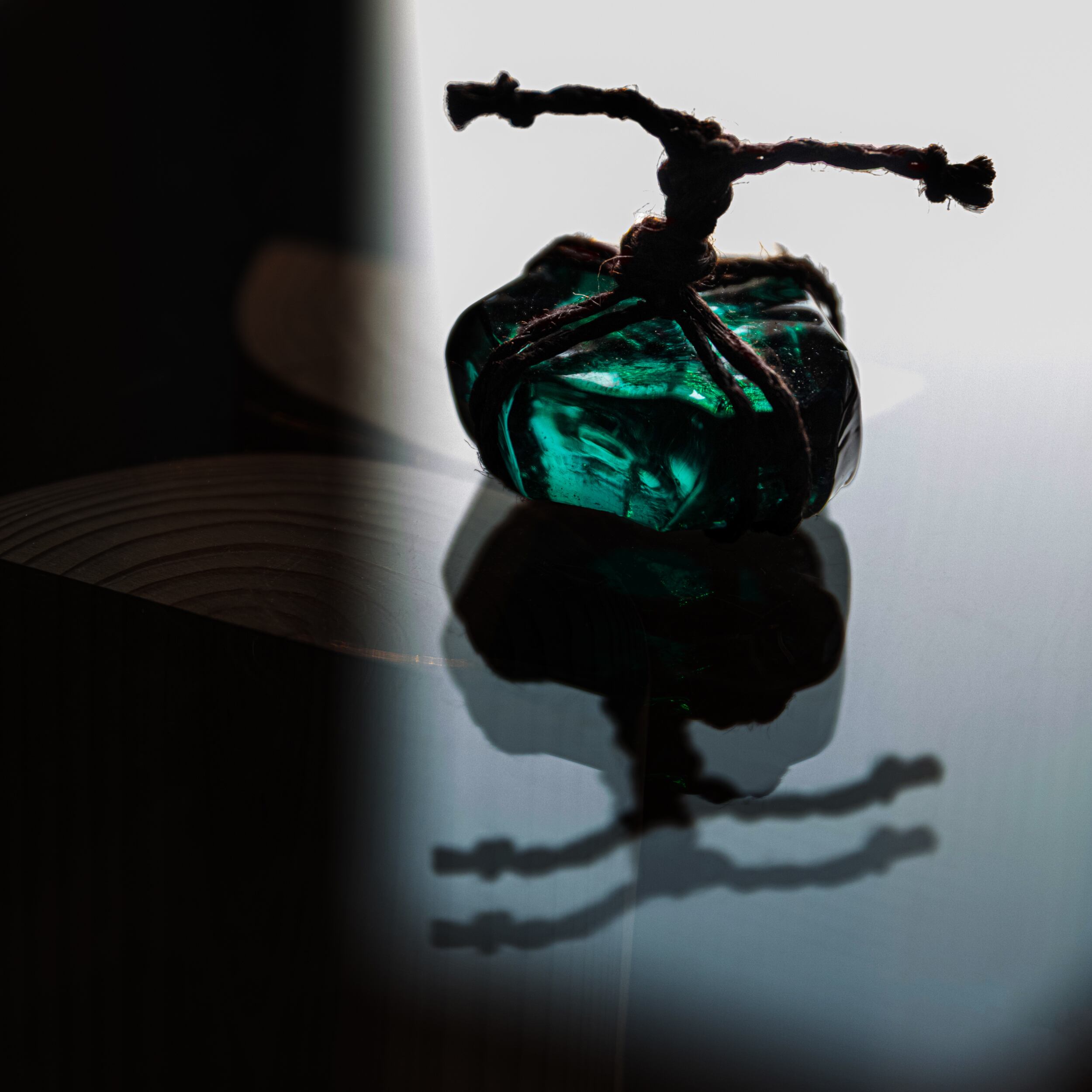 KYU is a SEKIMORI made from scrap stained glass tied with hemp rope used in Shinto rituals.