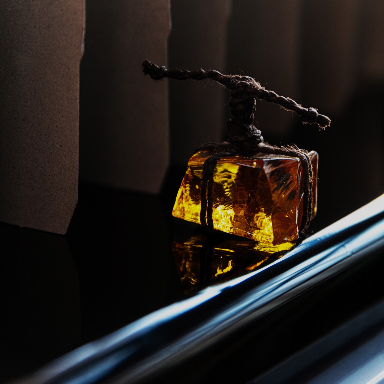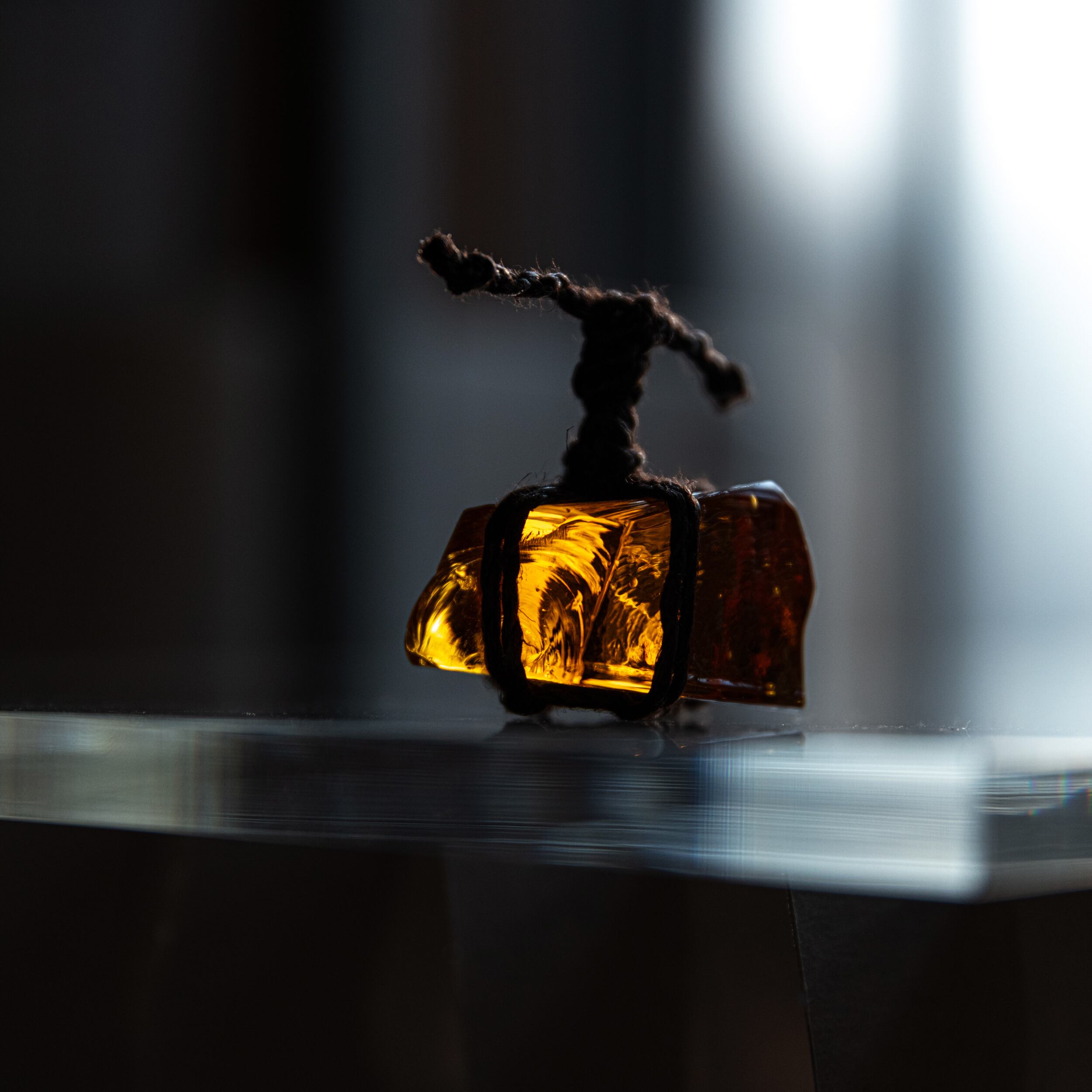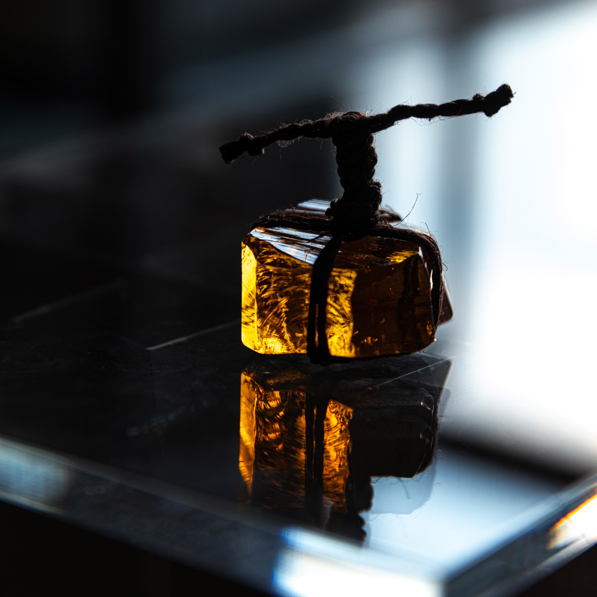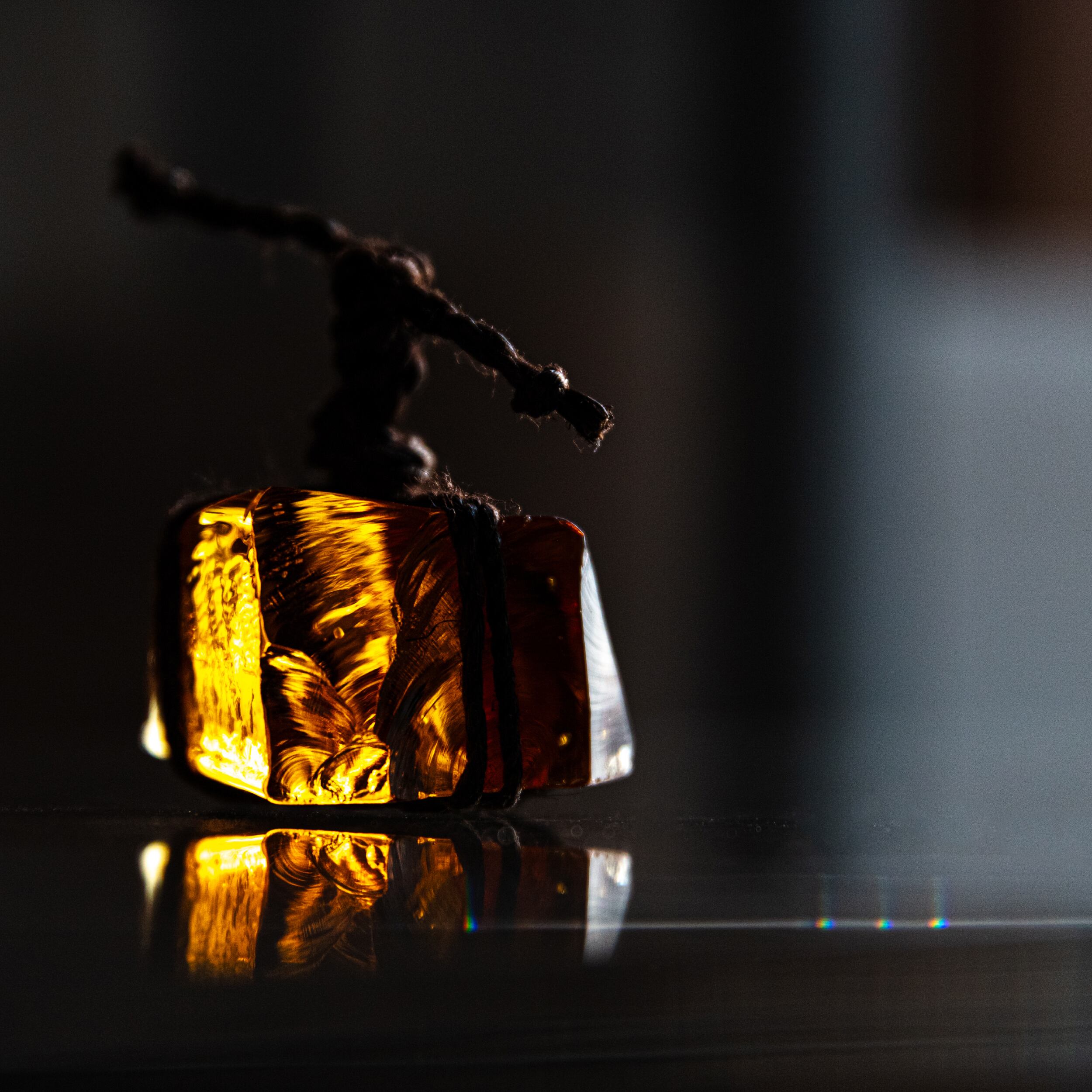 KYU is a SEKIMORI made from scrap stained glass tied with hemp rope used in Shinto rituals.